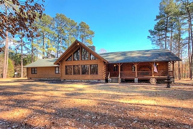 As hunting season and the holidays approach its time to live the dream of owning a quality Log Home nestled in the country on 10+ acres with trails for hunting, four wheeling and enjoying the great outdoors. New carpet in great room with a 2 story fieldstone gas fireplace. The wooden spiral stairs lead to a loft that could be utilized as an office or as it is with the fuzball table (which conveys). The kitchen has a propane gas log, beautiful refinished wood floors, double oven, ss refrigerator and dishwasher, NEW ss gas cooktop on the island and a large eating area with french doors leading to an aggregate patio for your outdoor entertaining. The bedrooms are spacious all with new carpeting. Master has a walk-in cedar closet and a bath with a large walk-in shower and a very large jetted soaking tub. Laundry area has cabinets and new vinyl floor. Aggregate walkway to the country front porch. Super convenient circular driveway with lots of parking. All this and only 15-20 minutes to Colonial Heights/Ft Lee. ZONED R-A Bring horses (not to exceed 10). BACK ON MARKET DUE TO FINANCING! ALL inspections are complete and repairs made!
