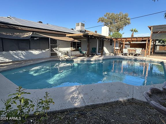 This home is the best value in the area, at 2,298 sq ft priced at $217 a sq ft. The home is a stunning single-level nestled on a corner lot with no HOA. There are 3 oversized bedrooms. The primary has 2 huge walk-in closets. The kitchen has been completely renovated, the roof replaced in 2023, some new lighting, freshly painted interior & exterior. In addition to the breakfast bar & the large island there is a dining room, an Arizona room to feel the tranquility of the private yard, a huge living room & a family room adorned with a fireplace & built in book shelves. Amazing desert landscape surrounds this home & large diving pool in beauty. The CUSTOM RV SHELTER & hook up is what you have been looking for your RV, boat & truck. MOVE-IN Ready