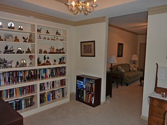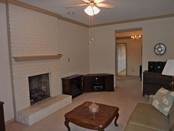 - LIVING ROOM DESC: Carpet, 9? Ceiling, Fireplace, Crown Mold, Window Cov, Ceiling Fan, Bay WDW