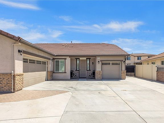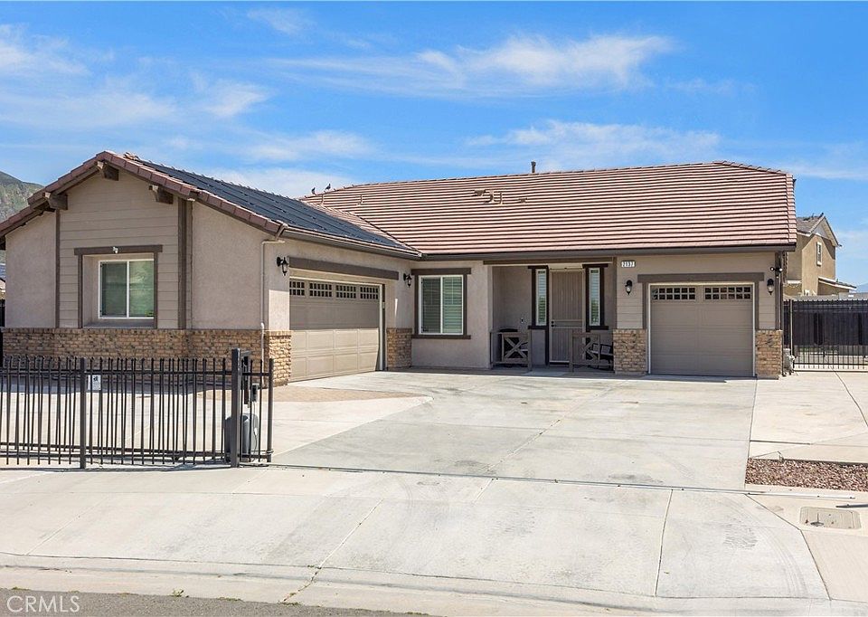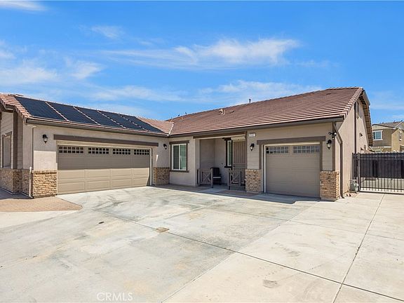 GORGEOUS LARGE POOL HOME! $150K+ in customized upgrades throughout; 5 bedrooms, 2.5 bathrooms and a HUGE backyard ideal for kids and pets to play or for large gatherings and events. 60ft long patio allows guest to thoroughly appreciate the breathtaking views of the San Jacinto Mountains. Pool features powerful Solar heater panels, redone vinyl flooring, state of the art Palapa Bar enclosing a built in kitchen/BBQ with granite counters, multi-weather protected electrical outlet for multiple TVs or sound system, Fire pit, Brick fence and new lighting on Patio, LED Jacuzzi lights. Top notch security system included with cameras all over the property and Ring Doorbell/floodlight cameras throughout. The house itself has freshly painted walls on the interior, tasteful crown molding, custom baseboards, wainscoting paneling, unique doors and door frames, and specialized window shutters. The gourmet kitchen includes Granite countertops with upgraded appliances. Family room has a large fireplace and ceiling surround sound system. The master bedroom has a very large walk in closet, relaxing soaking tub and walk in shower, dual vanity sinks. Solar panels, tankless water heater, laundry rm, rain gutters, pool metal fence barrier, front entrance Air curtain insect fan, RV parking, Electrical front security wrought Iron gate, 2 car garage with finished walls, window and shutters; There is also a separate garage for an additional car or storage. One the biggest lots in the community built in 2017, with no HOA.! Walking distance to local park and kids playground, minutes away from casinos. Perfect place to raise a family
