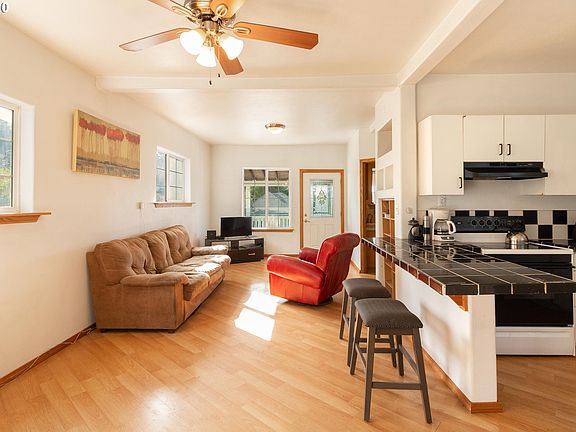 Charming two-story home with bay views and large covered front porch perfect for entertaining. Great starter home, vacation home, or short-term rental. Light and bright layout with high ceilings. Updated kitchen with peninsula breakfast bar & all appliances included. Spa-like bathroom has giant soak-tub. Private, fully fenced backyard. Fresh exterior paint. Great location walking distance to local shops & eateries. Close to Bandon Dunes golf resort, Mill Casino, and the regional airport.