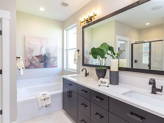 "The Kirkham" by Toll Brothers, is a large two-story home featuring a huge loft, formal dining, and the primary suite on the main floor. The grand open kitchen offers a large island with bar seating and lots of cabinets. Primary invites you with a soaking tub, full tiled shower, and a huge closet. Downstairs also find a secondary bed and bath, formal dining room and covered patio. Upstairs find three additional bedrooms with the large loft. Granite throughout. 3 car garage. Photos similar