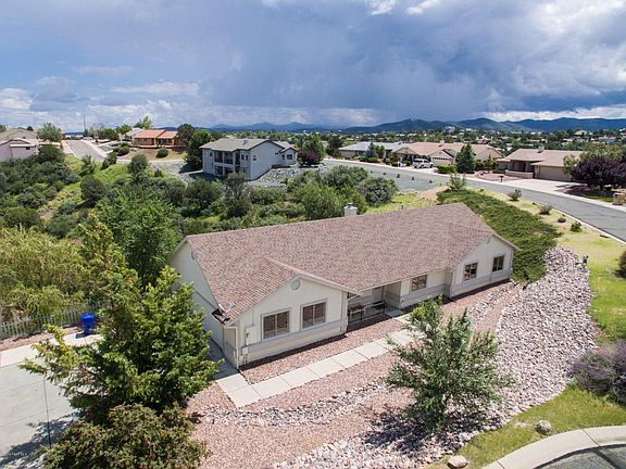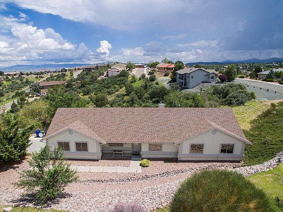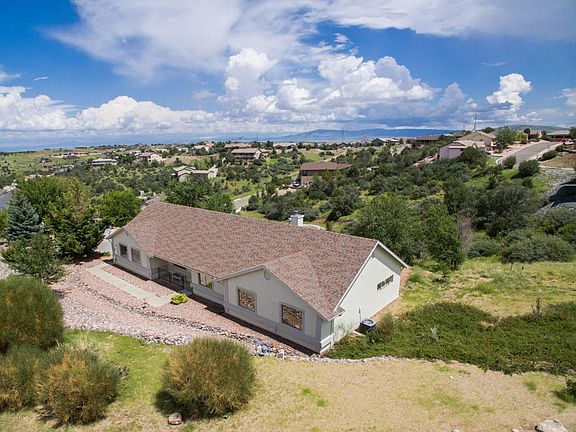 Great views and natural light at this conveniently located home in this desirable Prescott North Neighborhood. No HOAs! This single level home has vaulted ceilings and an open floor plan. It offers a separate a formal dining room, a laundry room and lots of storage through this well cared for home. There are 2 large pantry closets. The 4th bedroom has French doors and can also be used as an office or den. The master has 2 walk-in closets, garden tub and private exit to back yard. Beautiful views from the covered back patio and open deck area include the San Francisco peaks in Flagstaff! This home boasts of a large 2 car garage with extra storage or work space and also a large spacious cemented parking area.