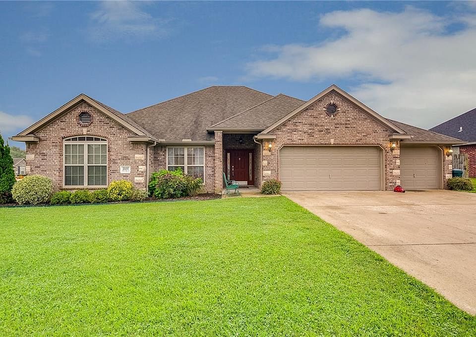 Beautiful brick home near Fayetteville & Springdale. Excellent Split BR floorplan features arched walk ways, crown molding, & new carpet. Cozy gas log fireplace in LR. KIT has stunning cabinetry, granite counters, & center island. Enjoy the oversized Master Suite w/trayed ceilings & double crown molding. MBA has his & her sinks, whirlpool tub, walk-in shower, & walk-in closet! Backyard is huge and has covered patio & wood privacy fence perfect for grilling out. Home sits on a landscaped 0.29 acre lot!