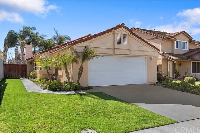 Hard to find single-story living awaits! Tucked into this quiet neighborhood you will discover this serene three-bedroom home boasting impeccable landscaping and a welcoming open floor plan. A light and bright setting is created from the numerous windows found throughout the living space. Soaring ceilings, neutral palette, plantation shutters and fireplace create an inviting environment to relax or entertain in. The kitchen offers warmly stained cabinetry, plenty of meal prep areas and is open to an eat in nook. Spacious master suite enjoys a private patio through slider, as well as a generous master bath with dual sinks and walk-in shower. Backyard enjoyment begins on the private sun-filtered patio perfect for morning coffee breaks or afternoon siestas, and a grassy lawn for outdoor play or gardening. Direct garage access to two-car garage. No HOA or Mello Roos, and situated within walking distance to Travis Ranch School and neighborhood park.