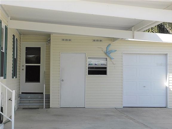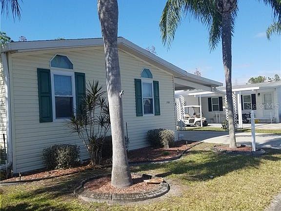 This charming 2 bedroom 2 bath home with just under 1,100 square feet is located on land-owned property in an active 55+ community. The home sits on a beautiful lot and provides wooded, golf and water views. Want to see more? Laminate flooring in the kitchen/dining area and carpet throughout the home. The kitchen has white cabinets and appliances. The master bedroom has a spacious walk-in closet and the master bath has dual vanities and a walk-in shower. The guest bath has a shower/tub combination. Step inside the spacious 12x14 Florida Room which has plenty of double-pane windows to enjoy the breathtaking views of the various wildlife. Sit back, relax and enjoy a fresh dose of Vitamin D as you soak it up and take it all in. Still need to work a little? There's an office area in the lanai! When you're done working, just close the door and leave the office and work behind. The over-sized carport/double shed offers additional room for storage and the golf cart is included in the sale of the unfurnished home. So get out in the community and walk, hike, bike, jog, golf, play tennis, pickleball or lounge by the pool. Here, you can be as active as you want and you'll be glad to call this community home! Start living the lifestyle you've always dreamed of! Amenities include two pools, two hot tubs, fitness center, Tennis courts, Bocce ball courts, Pickle Ball, Horseshoes, a clubhouse, 24 Hour manned guarded gate and lawn mowing.