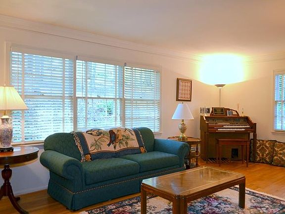 Quiet home nestled on the lot so that size and two stories are hard to see. Cute garden sitting area in front. Private back yard with handsome lawn reaching to the woods in back. Home is comfortable with a good floor plan. Great room has bar and fireplace. Living room spans the front of the house. Dining room at the side. Great room and kitchen walk out to screened porch with side grilling deck. Upper bedrooms are all good sized, especially the master. Lower level has finished den with second kitchen & bar, extra room and bath plus unfinished workroom and storage.