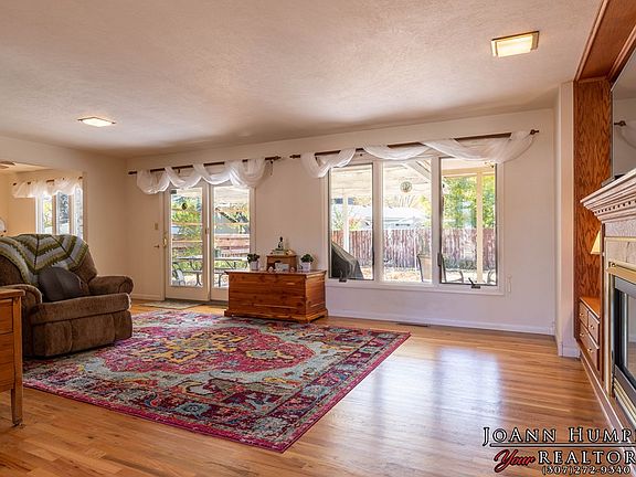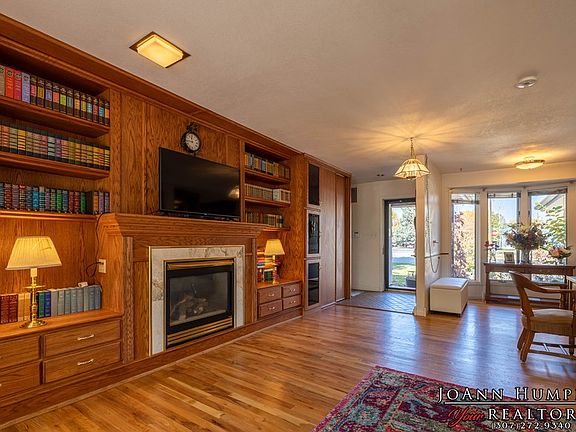 Affordable home close to shopping, library, rec center! Features LR with views to the back yard and covered patio. Beautiful wood floors/wood built-in book cases surround the gas fireplace. Kitchen, dining area with additional wet bar by office area. 3 bedrooms. Master features walk out door to patio, ideal for hot tub area. treed yard. This is a great home! Central air too!