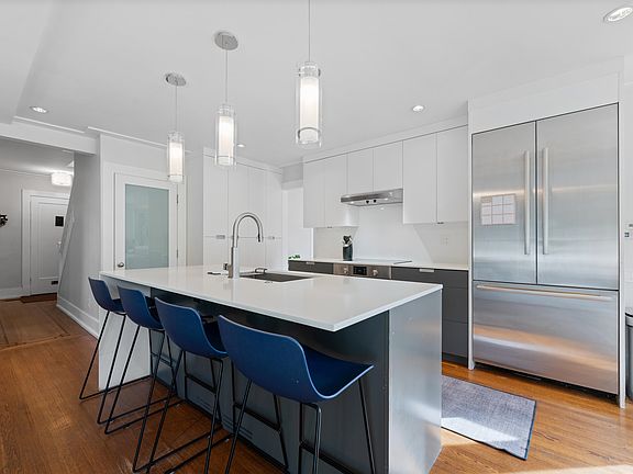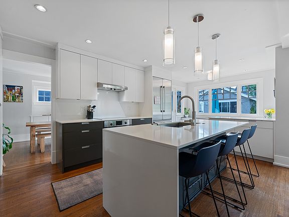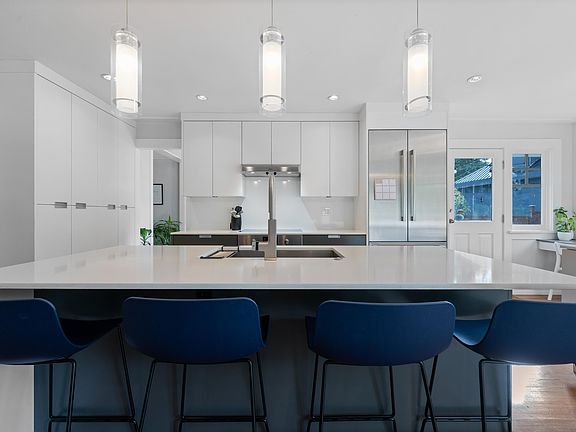 Renovated character homeOpen kitchenWhite cabinetryStone countersStainless steel bosch appliancesBright family roomSunny south-facing decks