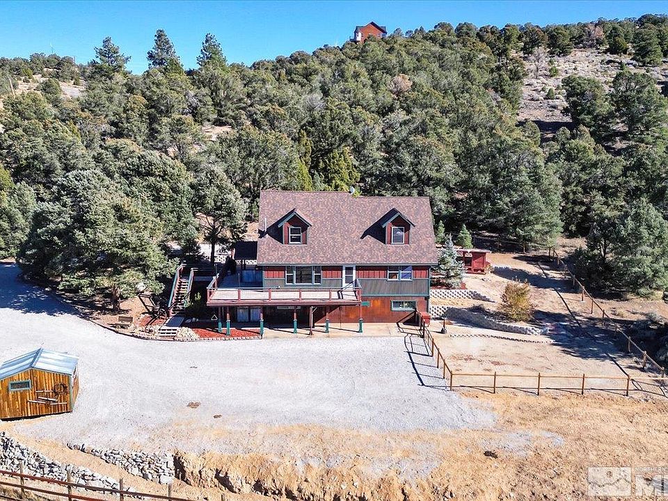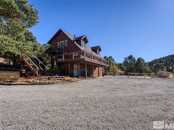This beautiful home, located in the highly desirable V.C. Highlands, offers an exceptional opportunity for a peaceful, private, and secluded setting, all while providing the benefits and amenities of South Reno. Situated on over 2 acres, it has ample space for all your toys, RVs, an additional shop or garage, or even the possibility of building extra living quarters.The home features 4 bedrooms and 2.5 bathrooms, filled with natural light and stunning views from every window., The kitchen includes a large center island, a cabinet pantry, and a breakfast bar, all of which open into a spacious breakfast nook that overlooks the mountains and trees. The inviting family room is warm and cozy, offering views of the expansive deck, surrounding trees, and the valley below. The generous primary bedroom shares this beautiful scenery and includes its own private deck, perfect for enjoying morning coffee, an evening glass of wine, or simply basking in the peace and quiet. You may even spot deer wandering through the nearby forest. The primary bathroom has been tastefully remodeled, featuring a large walk-in shower and double sinks. The exterior of the property is equally impressive. Enjoy a wrap-around deck, multiple patio areas, a fully heated workshop, and two large sheds. There is also a fenced area suitable for dogs or other animals, under-deck storage, a Connex box for additional storage, an engine lift, and a chicken coop, among many other features. The home showcases a great deal of designer ironwork, including custom metal siding, built fencing, gates, rails, and more. It also borders 44 acres of BLM land so you don't have to worry about anyone encroaching on your gorgeous surroundings. This is a must-see property, so don't wait!