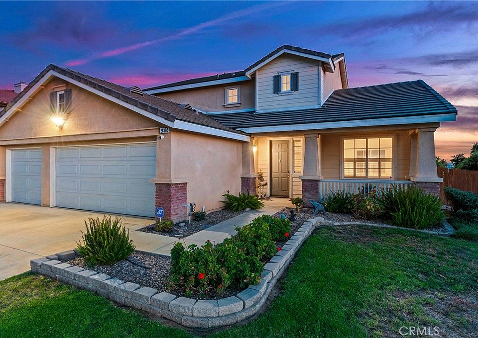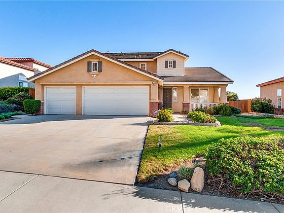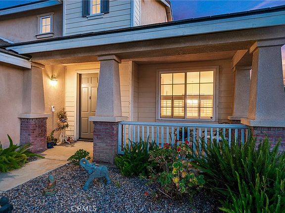 View, view, view! Truely turn key and ready for you to enjoy. See Photos and online walking tour. A meticulously upgraded and beautifully maintained two-story home that's sure to captivate you. This spacious 4-bedroom, 3-bathroom home offers 2,347 square feet of comfortable and luxurious living space, making it an ideal haven for anyone seeking both style and functionality. As you step through the inviting double door entry, you'll immediately notice the fresh, newly painted interior, setting the stage for a bright and contemporary living experience. The open floor plan boasts 9-foot ceilings, and designer plantation half shutter enhancing the sense of space and airiness throughout the home. The heart of this residence is the welcoming family room, featuring a cozy gas fireplace and a thoughtfully designed media niche area, perfect for relaxation and entertainment. Adjacent to the family room, you'll find a formal dining room, creating an ideal setting for family gatherings and special occasions.The chef's kitchen is a culinary enthusiast's dream, adorned with oak cabinetry, elegant granite countertops, large Island work station, and a suite of upgraded stainless steel appliances, including a range oven, dishwasher, and microwave. A pantry provides ample storage space, and the tasteful cabinetry adds a touch of sophistication to this functional workspace. The main floor also includes a separate laundry room, adding convenience to your daily routine. Ceramic tile and wood flooring grace the interior, creating a harmonious blend of durability and style. Upstairs, the primary bedroom suite is a retreat of its own, offering a large tub, a separate shower with a clear glass enclosure, and a walk-in closet with mirrored doors. Three additional bedrooms provide ample space for family members or guests. This residence is not only aesthetically pleasing but also energy-efficient, featuring central air conditioning, forced air heating, and vinyl-framed low-E dual-glazed windows. The home benefits from an energy-saving solar system, which not only reduces utility costs but also reflects a commitment to eco-conscious living. With a 3-car attached garage providing ample storage and parking space, this property is as practical as it is beautiful. Located in the desirable area of North Moreno Valley, your opportunity to enjoy a modern, upgraded lifestyle in a welcoming community. Don't miss out on the chance to make this house your forever home!