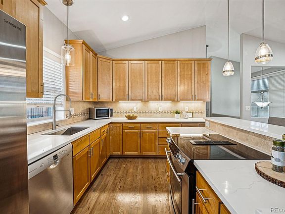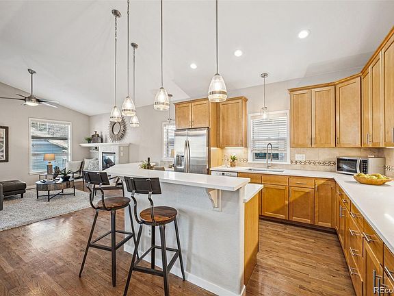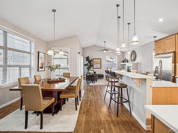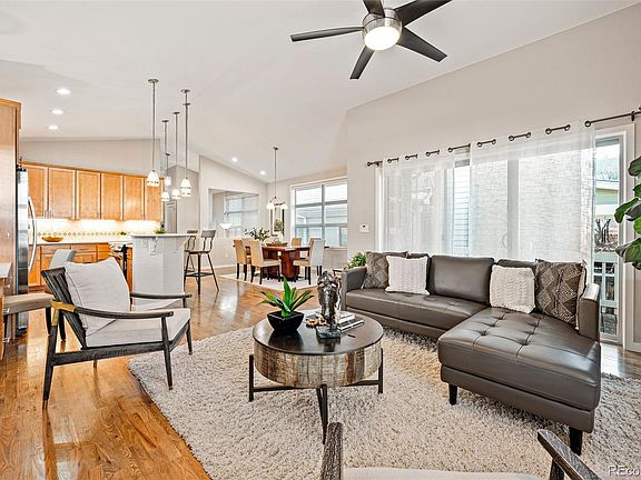Inside, the open and airy floor plan showcases beautiful hardwood floors, custom built-ins, and soaring vaulted ceilings that flood the space with natural light. The inviting living area features a cozy gas fireplace for an ideal area to relax. The kitchen is a chef's dream, with stainless steel appliances, quartz countertops, pendant lighting, and a modern tile backsplash. It flows effortlessly into the dining and living areas, making it perfect for entertaining. The serene primary bedroom is bathed in natural light and features a luxurious en-suite bathroom with double sinks, quartz countertops, a large vanity, and a spacious walk-in closet. A convenient powder room completes the main level. The fully finished basement boasts 9-foot ceilings and egress windows, making it feel bright and open. This versatile space includes a full bathroom, laundry room, two additional bedrooms, and a bonus/media room. Both the front and back yards are fully fenced, offering privacy and an excellent outdoor space for relaxation or entertaining guests. Perfectly positioned just seconds from downtown Denver via 23rd Ave, this home offers an unbeatable combination of style, comfort, and location.