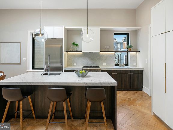 Elevate your lifestyle in this DC penthouse, equipped with top of the line finishes and wrapped in breathtaking city views. This 2 bedroom, 2.5 bathroom property underwent a complete renovation in 2019 and features 14 foot ceilings, three sun exposures, modern Restoration Hardware fixtures and a handsome loft area affixed with a wet bar and powder room convenient to the nearly 650 sq.ft. private rooftop deck. The rooftop terrace at 2139 is the perfect place to work, play, and entertain. Herringbone white oak flooring throughout the property offers a sense of elegance that compliments the chic double-thick Carrara marble countertops the chef's kitchen provides, alongside Thermadore stainless steel appliances and custom shelving. Off the kitchen and concealed by an 8 ft solid wood pocket door, the laundry room doubles as a sophisticated pantry space with marble counters and custom built in cabinetry - functional and beautiful! The primary bedroom offers two walk-in closets, floor-to-ceiling glass and a luxurious en-suite bathroom with handsome black marble accents. The dual-vanity is positioned to receive extraordinary morning light, opposite the curb-less, frameless glass enclosed shower and separate water closet. The guest suite offers tall windows, storage and a full bathroom with a large soaking tub and exquisite brass details found throughout the property. 1-car off-street parking is included.