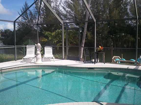 TOTALLY REMODELLED FRESHWATER POOL HOME in the SW CAPE with MAJOR ACCESS to MULTIPLE LAKES and canal systems, including Lake Kennedy! Wide OPEN FLOOR PLAN with upgraded tile throughout - kitchen to living and dining areas with stainless appliances and new HIGH-END dishwasher, including a pass-through to the HUGE A/C'd Florida Room with impact glass sliders. The amount of detail in this remodel MUST BE SEEN to be appreciated - crown molding throughout, exquisite trim work and top notch baths that POP - colors and tile work! Guest Bath with custom granite tops and crown molding also has access to the Pool area as well. Kitchen also has custom designed rollout drawers for fully accessible storage capabilities, including spice rack. HUGE walk-in PANTRY with microwave. Walk-in closets in all bedrooms. Laundry area includes a jetted sink. NEW hardware on all interior doors. 2005 NEW Roof. 2015 NEW A/C compressor and NEW Pool pump. 2014 Hot Water Heater was replaced. NO FLOOD ZONE!! LUSH landscaping with NEW Sod in 2013, newer sprinkler system and over $4,000 worth of palms and bamboo trees. OUTSIDE STORAGE AREA!! Absolutely great for entertaining! DON'T MISS THIS ONE!