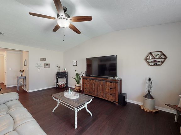 Fantastic one level home with 3 bedrooms and 2 bathrooms! Perfect home for entertaining! The foyer welcomes you into the spacious and completely open living area with gorgeous dark bamboo hardwood floors! The spacious living room with ceiling fan opens directly to the kitchen and dining area! The kitchen has double sink, dishwasher, stove, built in microwave and refrigerator that may stay plus a huge pantry! The breakfast bar opens directly to the dining area with french doors leading to a large patio that is perfect for grilling! Owners suite with ceiling fan and walk in closet has a private bathroom complete with luxury vinyl plank flooring and a beautiful custom framed mirror! Two nice size guest bedrooms, one with ceiling fan! Full guest bathroom with framed mirror! Linen closet! Laundry niche with washer and dryer that may stay! 2 inch blinds throughout! Attached one car garage! Large and level backyard! Great location convenient to shopping and restaurants, Bridgestone and I20!