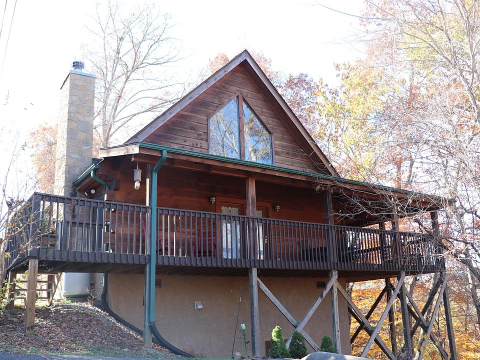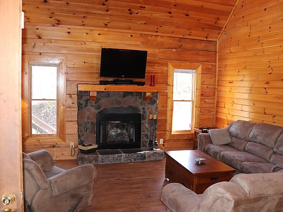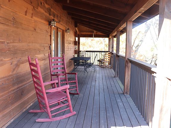 Authentic, well-maintained Log Cabin in Eagle Springs Resort with excellent overnite rental income potential. Living room features gas log fireplace, lg windows, and tongue & groove cathedral ceiling; adjoins kitchen/dining combo. Lots of upgrades like eng wood floors; tile baths; pantry cabinet; microwave range hood. Two bedrooms and 2 baths. MBR has private access to bath. 2nd bath is jack/jill to enter from BR#2 or hallway. All appliances and furniture shown convey. W/D in laundry/utiity closet. Potential to open loft for add'l space. Large wrap-around deck with nice wooded view. Low HOA fee covers pool; taxes, ins, and mowing on common areas; dumpsters; resort mgmt; security. Resort has pool and picnic pavilion for owners and guests. County maintained roads; city water & sewer. Furniture and appliances convey except for separate freezer. Will be removed prior to closing.