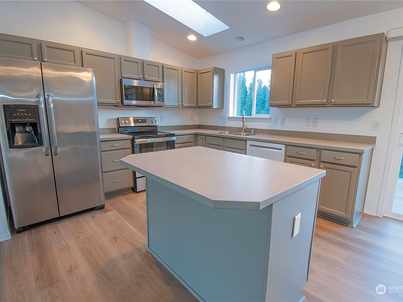 A roomy 4-bedroom, 3-bath residence featuring a sizable master bedroom with an attached bath and dual closets. The well-appointed kitchen includes an island, skylights, and access to a deck from the dining room. The living room showcases high vaulted ceilings and a welcoming gas fireplace. Situated on a spacious lot, ideal for a potential workshop, the property provides captivating mountain views. Additionally, the layout allows for easy conversion into a 5-bedroom configuration for enhanced adaptability.