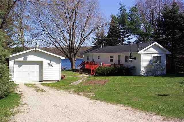 WHAT A GREAT YEAR-ROUND OR VACA LAKEFRONT! 90 FEET WOODWARD LAKE: GREAT FOR RELAXING ON YOUR PONTOON & LAZILY DRIFTING UNDER BLUE SKIES WITH SOFT FLUFFY CLOUDS SCUDDING ABOVE! PER PREVIOUS OWNER 1975 HOME WAS UPDATED WITH A PRETTY "MAPLE" KITCHEN, THERMOPANE WINDOWS, ELECTRICAL, PLUMBING, VINYL FLOORING, & NEW 4-INCH WELL! ADDITIONAL BONUS: HOME HAS VINYL SIDING & PITCHED ROOFING W/SHINGLES! THE GREAT FULL-LENGTH DECKING HAS ROOM FOR LAKESIDE BARBECUES, PLUS THE OVERLY-LARGE 16X44 GARAGE/WORKSHOP CAN HOUSE ALL YOUR LAKEFRONT TOYS! PROPANE GAS FORCED-AIR IS THE CENTRAL HEAT SYSTEM BUT OWNER HEATS PRIMARILY WITH PELLET STOVE! HOMES IN "SOUTHERN SHORES" ALSO HAVE THE USE OF THE "COVERED PICNIC PAVILLION" JUST AROUND A FEW BENDS! CHECK THIS LOCATION: LOCATED IN THE HEART OF OUR NORTHERN FEDERAL FORESTS YOU'LL ENJOY GREAT WINTER ACTIVITIES TOO, AS WELL AS HUNTING/ATV/ETC. CALL TODAY FOR YOUR PREVIEW!