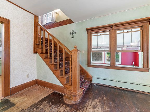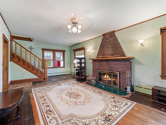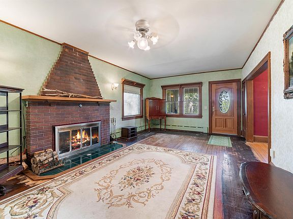 This home sits on top of the hill, providing a private yard while enjoying the benefits of living in town. Close to Pinehurst Park. This home has all the details to love about an old house like the wood floors, built-ins, brick fireplace, and beautiful wood trim, stair railing & banister- all waiting to be brought back to life. Practical layout that flows from kitchen to formal dining to a large living room. There's an addition in the back of the home that has abundant natural light and in-floor heat. Upstairs there are 3 bedrooms and a bathroom. The basement has an additional bathroom with a shower that is combined with the laundry room. There is a finished room in the basement that can host a space for your hobbies or serve as an office. The yard is elevated from the street level, making it feel intimate & peaceful. Detached garage and off-street parking space off the alley.