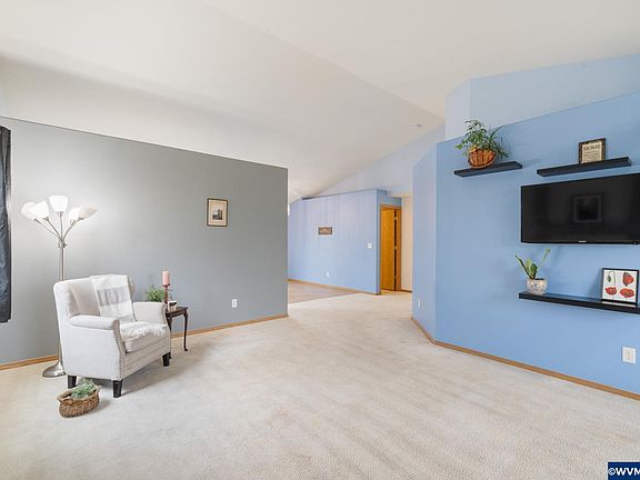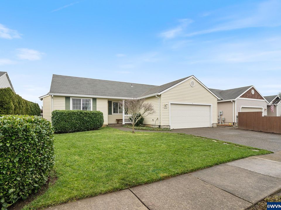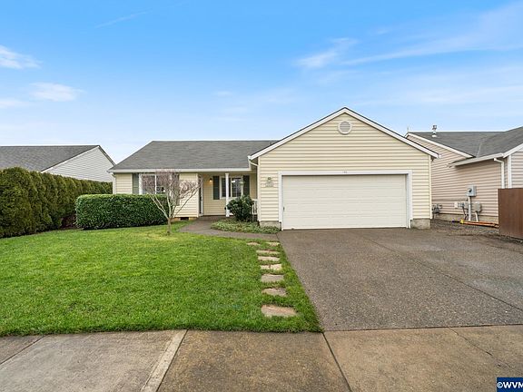 Welcome to this 3-Bd,2-BA Ranch style. Inviting Living Room w/vaulted ceiling, cozy gas fireplace, mounted TV. Vaulted Dining. Kitchen boasts Pantry and abundance of cabinet and counter space. Retreat to the Primary Bedroom, complete w/full bath. Both Primary and front BR have ceiling fans. Equipped w/heat pump and gas furnace, both approx 6 years new. Extra-deep 2-car garage, workbench, shelving, new man door. Generous covered patio. Fenced bkyd w/pear, cherry, shed/playhouse, swing set. Fiber available!