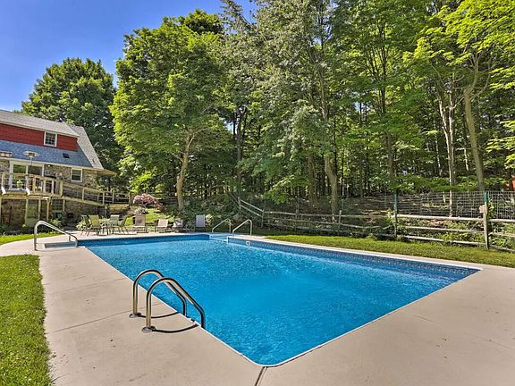 Feel at home in this stunning 3-bedroom, 4-bathroom home tucked away in the woods of Monroe. This spacious retreat combines modern amenities with rustic cabin vibes, offering the perfect blend of comfort and style. This home features smart TVs, Wi-Fi, air conditioning and heating, a game room with a foosball table and arcade cabinet, a jetted tub, a wraparound deck, fireplaces, a washer and dryer, towels and linens, and an outdoor dining area with a barbecue grill. The fully stocked kitchen includes stainless steel appliances and cooking utensils, with coffee and tea provided. The main living area features wood-paneled high ceilings, skylights, and glass patio doors. There are buttery leather couches, and a stylish wet bar. Enjoy the heated pool and hot tub. Free private parking is available in the driveway, which can accommodate up to 6 vehicles. There is a fee of $150 per day to use the pool heater. While the barbecue grill is available for your use, propane is not provided. Located just minutes from scenic New York state parks, ski resorts, and wineries, this home is surrounded by trees on a private plot of land. Nature enthusiasts can explore the private backyard with a lush garden. The heated in-ground pool is available from May 15 until the beginning of September. Includes two laptop-friendly desks. The home offers a rustic, cabin-like mystique, but is also decked out with modern conveniences and deluxe features.