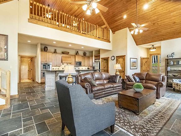 This spectacular custom home is situated on 35 acres in the middle of aspen and pine trees and borders the Kit Carson National Forest! The open great room design has as it's focal point a massive stone fireplace and a wall of windows from which to enjoy the mountain views. The spacious kitchen features granite counter tops, sold wood cabinets and stainless appliances including a double oven. Large master suite located on the main floor with private deck, wood floors, dual sinks, bathtub and shower. There is a large game room upstairs with a pool table, a guest suite, bathroom and private deck. 2 more bedrooms are found on the lower level, each with private baths, walk-in closets, slate tile flooring and private patio access. It is permitted for horses also. In addition to the large attached garage you'll also have a detached garage/workshop. It's hard to find this quality of home plus the 35 acres bordering the national forest. You better come check it out!