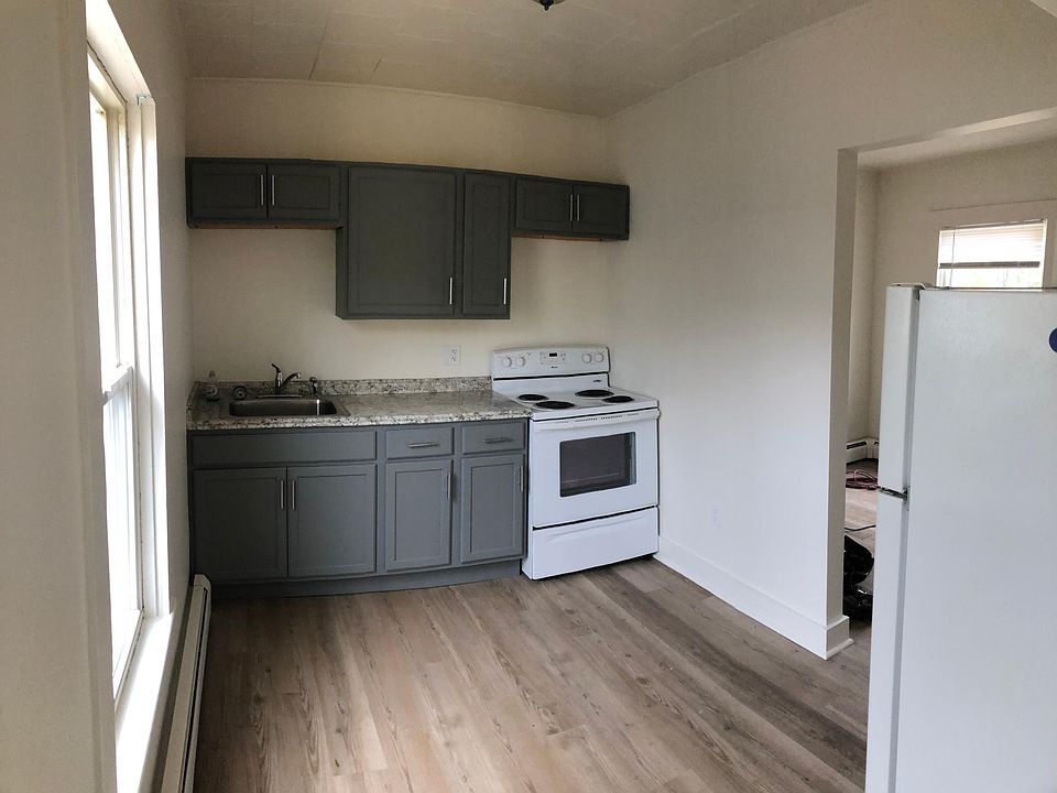 This unit has new kitchen cabinets, new flooring, updated bathroom, wood floors and an outside private covered porch. Small living room, but good size bedroom. Full size appliances and full tub. Rent includes heat, parking, trash removal, snow removal, water & sewer. Tenant is responsible for electric.