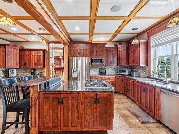 - Kitchen Island, Wet Bar, Walk-In Closet(s), Storage, Pantry, Open Floorplan, Granite Counters, Entrance Foyer, Eat-in Kitchen, Double Vanity, Crown Molding, Bookcases, Breakfast Bar, Built-in Features, Beamed Ceilings, Ceiling Fan(s), Natural Woodwork, Recess Ceiling(s), Recessed Lighting