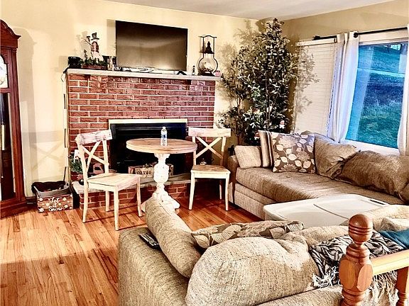 Step inside a cozy living room featuring a gas fireplace, ideal for those chilly evenings spent curled up with a book. The sliding glass doors open to a side porch/deck, inviting natural light and fresh air into the living space. Adjacent to the living room is a well-appointed kitchen, complete with modern appliances and ample counter space. Enjoy casual dining in the adjoining dining area, creating a seamless flow for entertaining. Venture downstairs to the lower level, where you'll find an additional family room illuminated by the soft glow of a pellet stove. Step outside onto the private porch, where you can soak in the tranquility of the lush backyard. The home also features two sheds, providing ample storage space for all your outdoor equipment and tools. One of the sheds even boasts electric, offering convenience for DIY projects or additional workspace. Convenience of a heated garage, this home delivers exactly what you are looking for in a quiet area close to everything!