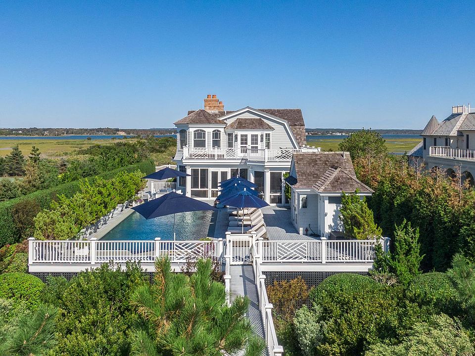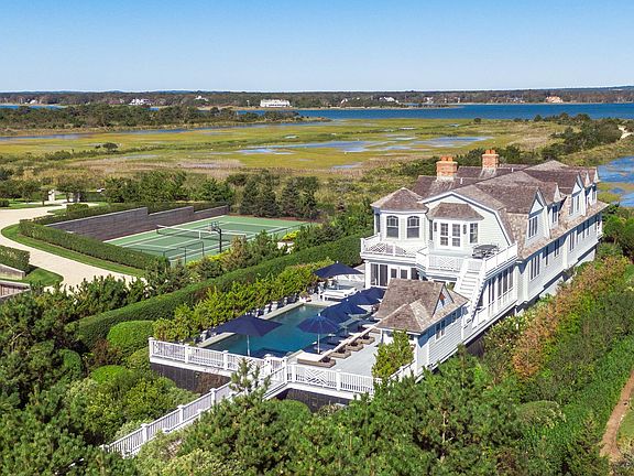Having it all never looked so good. Solidly built and stunningly appointed, this custom oceanfront retreat is a study in elegance and discerning design. Sited on 1.4 protected acres directly on the Atlantic, the gated estate features an 8,038-square-foot main home, and approximately 103 feet of frontage, picturesque walkway to the ocean and sandy beach, sunrise and sunset views over the water, and an expansive deck with heated pool and spa. The premiere property also comes with gorgeous views of Penniman Creek and surrounding conserved land across Dune Road. Lovingly constructed with an eye for detail and with luxury touches throughout, the main residence features six en suite bedrooms and a total of eight-full-and-one-half baths, including a primary bedroom suite with double closets and baths and its own oceanfront balcony; a chef's kitchen built for entertaining; and a pair of gas fireplaces. An accompanying complementary cabana-style guest cottage features a half bath, kitchen and outdoor shower. Additional noteworthy distinctions at the circa-2004 estate include exceptional structural integrity, extraordinary craftsmanship and a fortified beachfront dune.