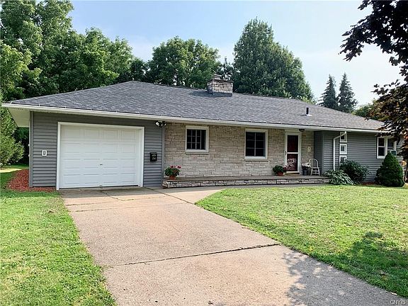 Convenient single floor living with potential for in-law apartment. Spacious 3 bedroom Ranch with full walk-out basement leading to patio. Brand new roof and hardwood flooring throughout most of the house. The garage door leads to a shed, the garage has been renovated and is now a familyroom. Updated eat-in-kitchen with pantry, custom cabinetry, granite countertops and newer appliances. All appliances stay including washer & dryer. Large living room with woodburning fireplace surrounded by solid wood built-in shelving and storage. Access the family room through french doors from the kitchen and living room. Full walkout basement is partially finished, half bathroom, office, laundry area and plenty of storage space. With a little work, the lower level would make a great in-law apartment or student suite. Private backyard with plenty of room for a pool! Convenient location within walking distance to schools, hospital, shopping and a quick commute to SUNY Oswego. Taxes are shown without exemptions.
