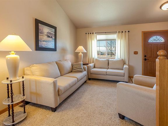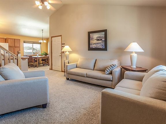 This beautiful home has been lovingly cared for, nothing to do but move in! Located at the end of a no through traffic street, and backs onto a small acreage. Experience peace and tranquility as you enjoy the peak-a-boo views of the mountains. Lots of natural lighting with cathedral ceilings and open floor plan; 3 bed, 2 baths on upper level and large family room half-bath and laundry on lower level. Sunroom and landscaped backyard are perfect to relax or entertain; mood lighting on sheds and fence stay.