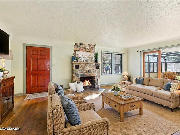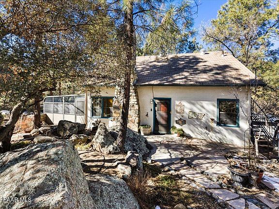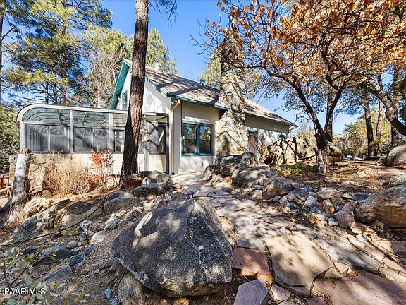 Here's a charming and versatile cottage sitting on two lots among granite boulders and tall pines that beautifully blends 1940's Prescott character with thoughtful updates. The cove ceilings, original hardwood floors & stone fireplace really emphasize the home's vintage appeal, while the updated kitchen and sunroom add modern comfort. 2 bedrooms, 1 bath completes this level. Upstairs is perfect for an in-law/apartment set up w/bath & kitchenette + interior & private exterior access. Basement/workshop & garage on lower level with house access. Landscaped artistically and the completely fenced patio will become your favorite place to enjoy the park like setting the additional lot provides. Located just one mile from historic Downtown Prescott!