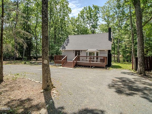 Welcome to 214 Lake Rd, Dingmans PA! This delightful 1,008 sqft, 3-bedroom, 2-bathroom home is nestled in the serene community of Marcel Lake Estates, offering a perfect blend of comfort and modern living. Step inside to a welcoming living room featuring a brick-faced fireplace with a Pellet stove insert, vinyl flooring, exposed beams, vaulted ceilings, and a large picture window that fills the space with natural light. The open-concept design leads you to a spacious kitchen with a dining area. It boasts tile flooring, granite countertops, a large island, stainless steel appliances, exposed beams, a wooden ceiling, and a sliding door that opens to a charming back deck and cozy backyard. This 1.5-story home offers 1 bedroom and 1 full bath on the main level, while the upper level houses 2 generously sized bedrooms sharing another full bathroom. Enjoy outdoor living with a large front deck and a driveway that accommodates multiple vehicles, ensuring ample parking space. Marcel Lake Estates is a gated community with an array of amenities for residents, including two fish-stocked lakes for fishing and boating, a clubhouse for gatherings and events, a refreshing swimming pool, a playground for children, tennis courts, and much more! Nestled in the woods, this home offers privacy and peace of mind while being conveniently close to town. It's an excellent commuter location within the Tri-state area of NY, NJ, and PA, making it perfect for those seeking a tranquil retreat without sacrificing accessibility. Don't miss the opportunity to make this charming house your home! Contact us today to schedule a viewing.