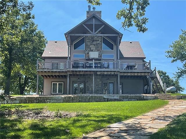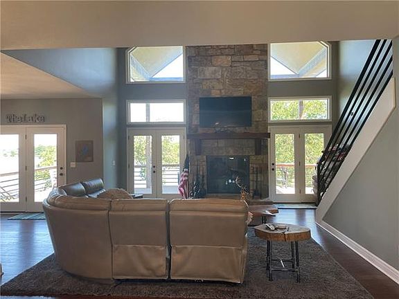 Perfect Location for this almost 3,000 sq ft gorgeous home. It is located just behind the buoy only a few homes away from the Main channel, providing it with wonderful main channel views and yet having the benefits of calm deep water for dock and swim area. Open concept, entry, wood and tile flooring throughout. Granite, stainless appliances, coffee bar, fabulous bar area w/ wood top, dining area, living area with floor to ceiling stone fireplace. 2 sets of walkout doors to lakeside deck with permanent floor decking, outdoor stone fireplace with TV, .5 bath, Master Suite all on main level. Loft with plenty of sleeping and play area. Lower level has 3 bedrooms, bath which has outside lake entrance and a family room. Home comes complete with inside and outside furniture, game table, tv's, etc... Move In Ready! Gently sloping lot to waterfront with 128 ft of shoreline. 2 bay covered boat dock with 2 lifts, 2 jet ski ports, swim deck, storage area on dock, tie-up dock, entertainment building with covered outdoor area and storage building. Extra-large 2 car garage and concrete drive. Pontoon boat and jet ski available to purchase.