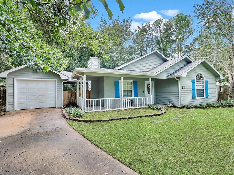 Your new home awaits! Settled at the end of a cul-de-sac, this charming home is the secluded spot to be. Upon passing the inviting front porch, the open living space welcomes you. A wood burning fireplace and elegant vinyl flooring tie this space together. Flowing seamlessly from the living room, the white cabinetry and grey granite countertops in the kitchen brighten the whole place up. The primary bedroom features a walk-in closet and en suite bathroom, complete with soaker tub and separate shower. Between the home and detached garage is a covered patio for all to enjoy. Extending beyond the patio is a fully fenced backyard. The roof is just 2 years old, and this home is equipped with termite prevention protection. Want to see this beauty in person? Schedule your showing today!