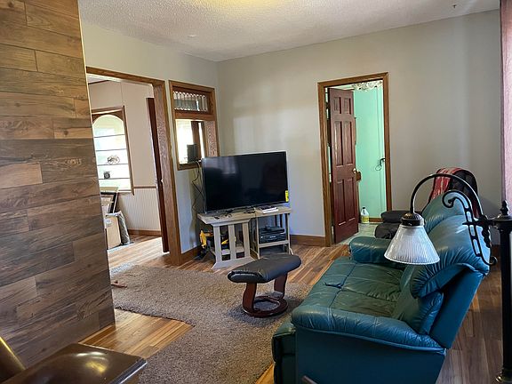 Are you ready for small town living? This home is nestled on 3 city lots and is ready for a new owner! Upon entering the room you will be greeted in an entry way with closet space. The open concept leads into the dining room and kitchen. Notice the Red sparkled countertops throughout the kitchen featuring a walk-in pantry. The cabinets throughout the kitchen offer plenty of storage space. Off of the living room there is a sunroom. There is a main floor bathroom featuring a whirlpool tub. Upstairs you are welcomed by a family space. There are two bedrooms and a bathroom as well. The second bedroom has a balcony right outside! The windows, carpets, and the flooring in living area are among some of the recent updates to this home. The propane tank on the property is owned, so no rent! The oversized 2 stall garaged was used as a wood working shop. You will love the extra space it has to offer! The shingles were replace approximately 4 years ago. Contact your favorite realtor for a showing today!