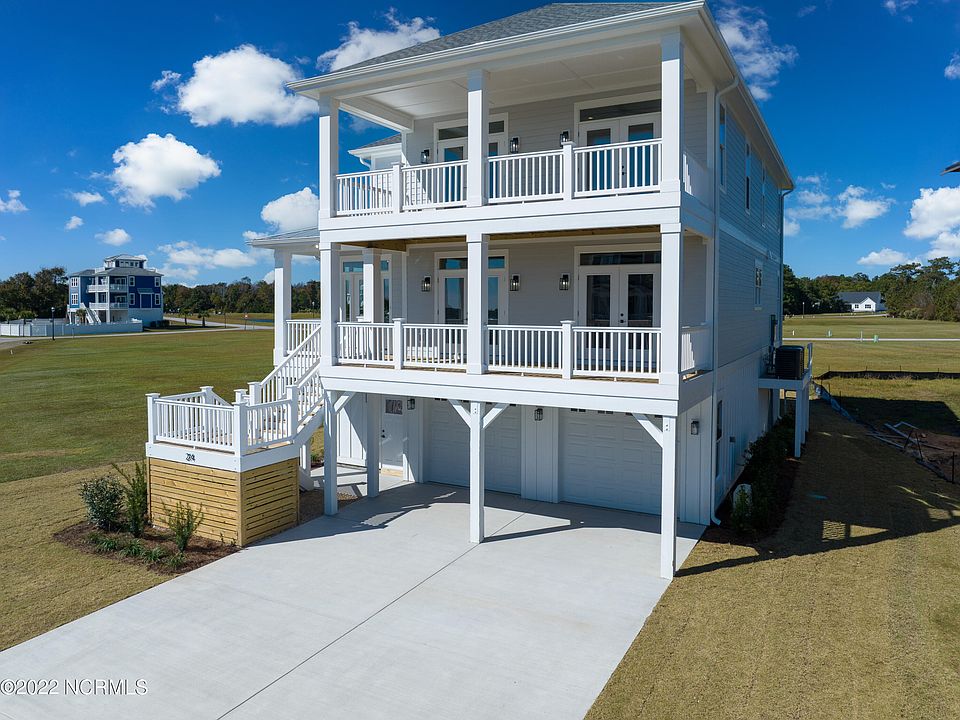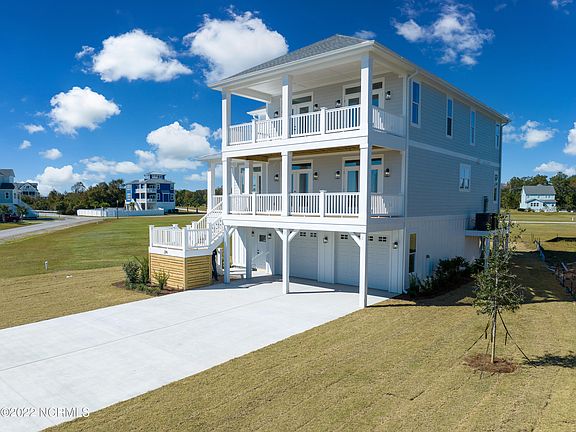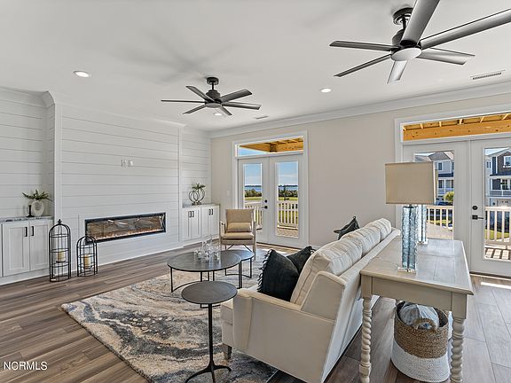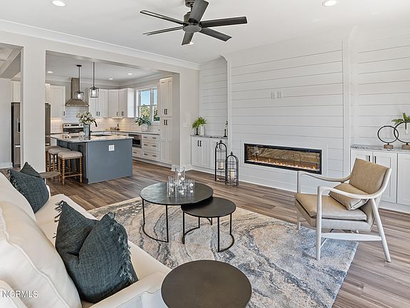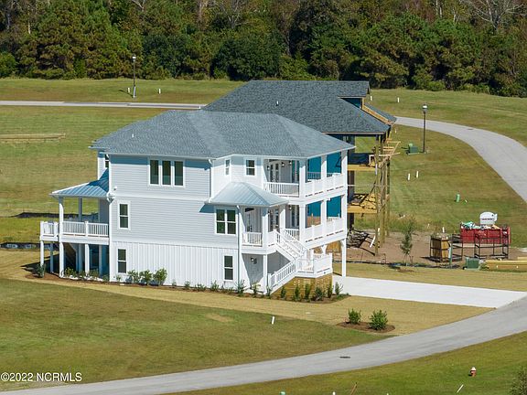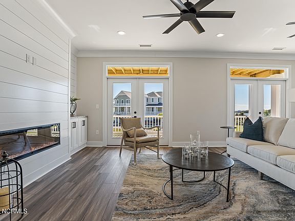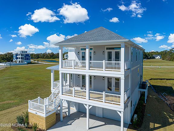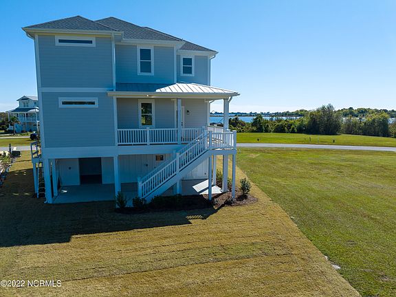 Welcome to this spectacular home built by New Life Building Company, in the desirable coastal gated community of Summerhouse on Everett Bay! Enjoy the gorgeous water views from its decks, and the open concept floor plan of this 4 BR, 3.5 bath beauty. Built for entertaining in mind, the kitchen, living room, and dining spaces are open and airy, and make the perfect gathering space for family and guests. Located on the top level, the spacious master suite is a peaceful retreat with exquisite views of the Intracoastal Waterway and is equipped with a nice- sized walk in closet, tray ceiling, and plenty of room for a sitting area or home office. The spa-like bath is complete with dual sinks and a large, tiled walk-in shower. Special noteworthy features include: LVP flooring throughout, an elegant electric fireplace, tons of beautiful interior finishes including a coffered ceiling in the dining space and splashes of shiplap, deck spaces galore, full irrigation, an elevator, a storage room/golf cart garage off the back of the house, spray foam insulation, and a second master suite located off of the kitchen for convenience. Summerhouse is definitely the place to be if you are looking for a waterfront community, rich in amenities, located within a short commute to Wilmington, Jacksonville, or Surf City/Topsail Beach. Neighborhood amenities are plentiful, and include a gigantic resort-style community pool with a lazy river, spacious clubhouse, fitness center, walking trails, tennis/pickleball courts, day docks, a small craft boat launch, playground, and more! Look no further, and make your appointment to take a peek today!