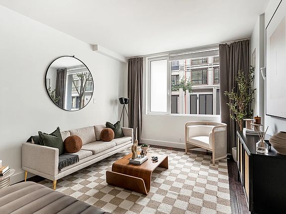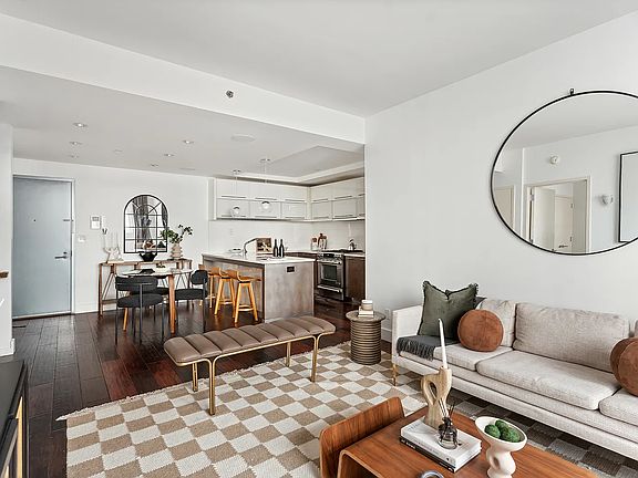 Welcome home to this over 1300 sq foot, 1 bed/convertible 2, 1.5 bath duplex in an amenity-rich Williamsburg condominium. Enter this extra-large abode via the spacious foyer and be welcomed by a bright living/dining space with beautiful dark hardwood floors and overhead lighting. The island eat-in kitchen is perfect for entertaining guests and features stainless steel Jenn-Air appliances including a dishwasher, and plenty of overhead storage. The primary bedroom can easily fit a king bed and has a large closet already outfitted for any owner's needs. Head on down to the lower level of the home where you will find nearly 600 square feet of space that can easily be turned into a sleeping area, den/tv room, with enough space to also create a home office. Downstairs also has an extra half bath and tons of cstorage space. Amenities include a full-time doorman, entertainment lounge, fitness center, and roof deck. Just a few blocks away from McCarren Park, the Bedford L, and Nassau G trains, and the endless variety of shops, restaurants, cafes, and bars that Williamsburg has to offer. Parking space is available separately.