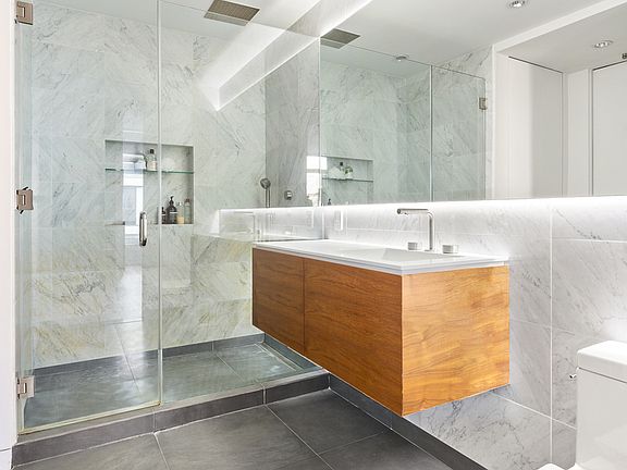 The A Line at 214 N 11th St is the largest one bedroom line in the building. This bright and sunny, 832 Sq Ft unit, is currently configured as a one bed plus Home Office, with Juliet Balcony. Unit 4A boasts floor to ceiling windows, wide plank white oak hardwood flooring, recessed lighting, and high ceilings throughout. The living room is expansive for flexible layouts, accommodates a home office or easy nursery room conversion, and features a charming corner window for your pet to gaze out of midday. Open the doors to your Juliet Balcony for fresh air and a small home garden. The open kitchen concept is perfect for entertaining, complete with vented hood, stainless appliances, and room for two chefs! The bathroom has been fully renovated and feels more like a luxury spa, complete with floor to ceiling Carrara Marble tile, back lit mirrors, floating vanity, standing shower, linen closet, and Washer/Dryer. Access from both living room and bedroom. The large bedroom accommodates a king sized bed & plenty of furniture, en suite bathroom access, and walk-in California closet. Owner has spared no expense in recent renovations and the apartment is in excellent condition with ample closet storage, and additional building storage available. Central Air throughout! Warehouse 11 is a modern condominium with amenities including a full-time doorman & porters, private garage, resident's lounge, fitness room, bike room, children's playroom and a common landscaped furnished roof deck. Enjoy low taxes with the current Tax Abatement until 2025! The building is impeccably maintained and accepts packages, dry cleaning, deliveries, etc. 214 N 11th St located just blocks from the L & G trains, and one block away from a CitiBike stand at McCarren Park. Lilia, Egg, Jimmy's Dinner, Casa Publica, are just a few of the popular nearby establishments. Private parking space is available on the first floor of the building garage, easy access, and offered at $70k, sold separately.