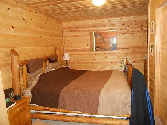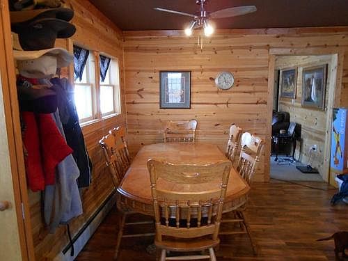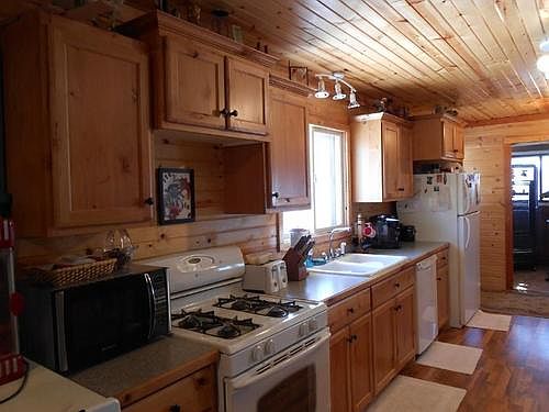 New knotty pine interior walls, new ceiling, custom made cabinets, large kitchen island, large masterbedroom, wrap around deck, fenced in yard, 2 stall detached garage!