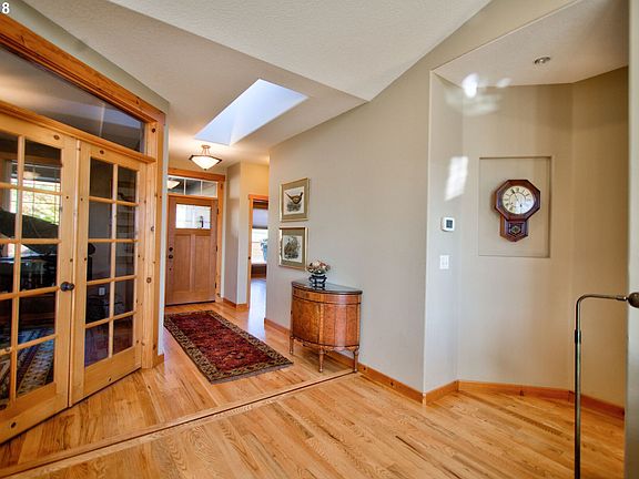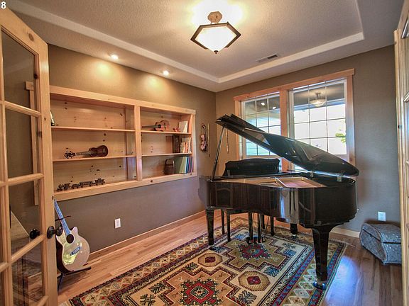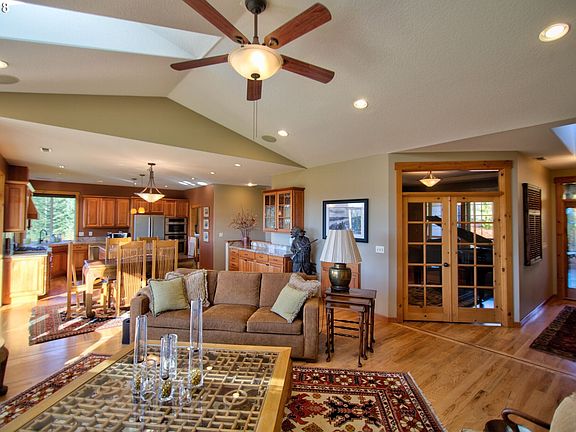 Custom home on 5 acre horse property. Gourmet kitchen, granite counters, and hardwoods throughout main. Main level master suite with dual head shower, heated floors, additional bedroom, bath and office on main. Huge windows, skylights, surround sound, laundry rooms, lots of storage, incredible covered deck on main, patio off daylight basement level. Shop/barn, fenced for horses. Main bathroom mirror, wine fridge and tv not included.