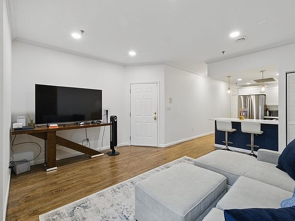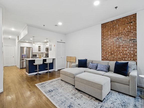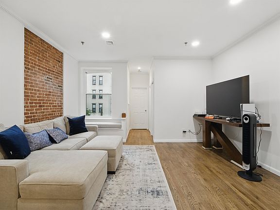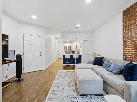 Beautifully updated 2BR 1.5BA condo on one of Hoboken s most desirable tree-lined streets, just minutes from Church Square Park. This bright and spacious home features a modern chef s kitchen with quartz countertops, stainless steel appliances, large island with pendant lighting, and a new refrigerator and updated backsplash. The open layout includes a separate dining area, exposed brick, and a welcoming living space perfect for entertaining. The primary bedroom easily fits a king-size bed and includes a custom walk-in closet, oversized bay windows, and new blinds. The renovated full bath features a new sink and toilet. The spacious second bedroom, also with new blinds, is ideal for a variety of uses. With south, east, and west-facing windows, this home enjoys abundant natural light throughout the day. Additional highlights include hardwood floors, crown molding, recessed lighting, central air heat, new washer and dryer, and fresh white paint throughout. Private storage sapce in basement as pictured. Enjoy all that Hoboken has to offer with nearby shopping, dining, nightlife, and easy access to PATH, bus, and ferry.