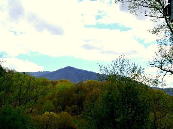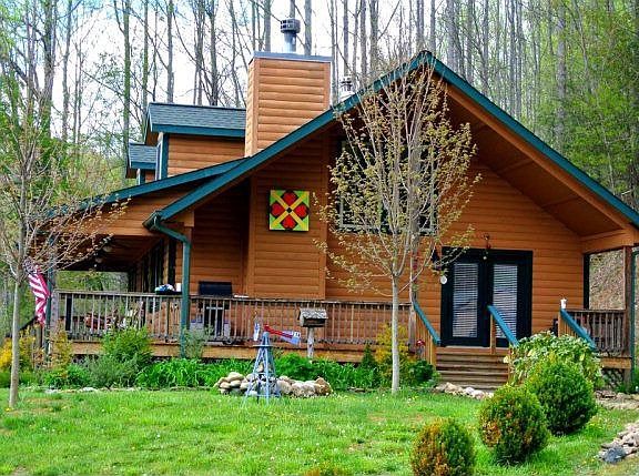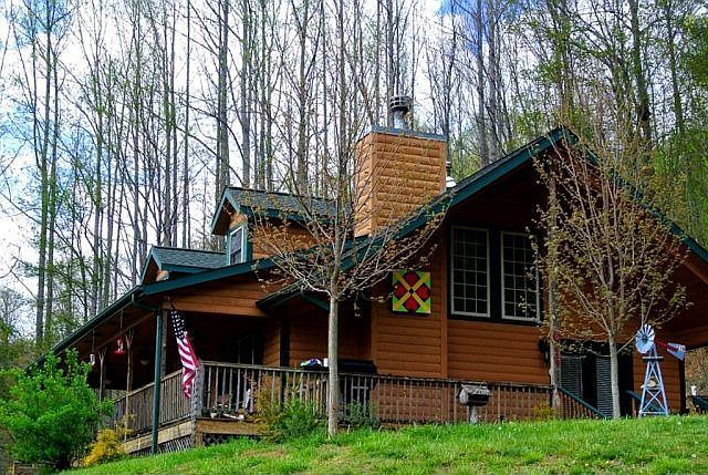 Log Cabin w/Scenic 4-season mountain view; 2-bedrms plus sleeping loft; upgraded kitchen with glass tile backsplash, granite countertops, island, stainless appliances; Oak Hardwood floors, Vaulted ceiling, Stone Fireplace, decorative wood & metal staircase; 400+ feet of covered porches; Garden space, fruit trees, 14 x 20 outbuilding; Excellent full-time or vacation home; easy access;