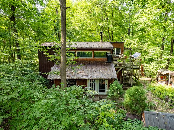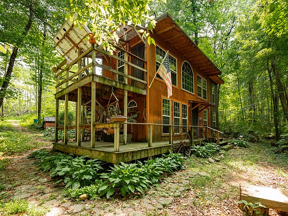 2.38 acres of off grid secluded woods w/unique 2 story cabin nestled upon a ridge w/spectacular views overlooking picturesque Fall Creek.Share your morning coffee with an abundance of deer, cast a line in the creek for smallmouth bass, watch eagles & blue heron glide along the creek, and listen to owls & wildlife chatter in the evening. Walking distance to golf course & downtown Pendleton! Formerly home of the Giant Earthship; a sanctuary w/rich history & previous tourism of a homestead built to protect nature & environment to gain freedom from the types of energy sources we depend on daily. There is no well, septic or electrical, but new Buyer could get permits and pay to hook up to electric and possibly Fall Creek Regional Waste! Appt Req