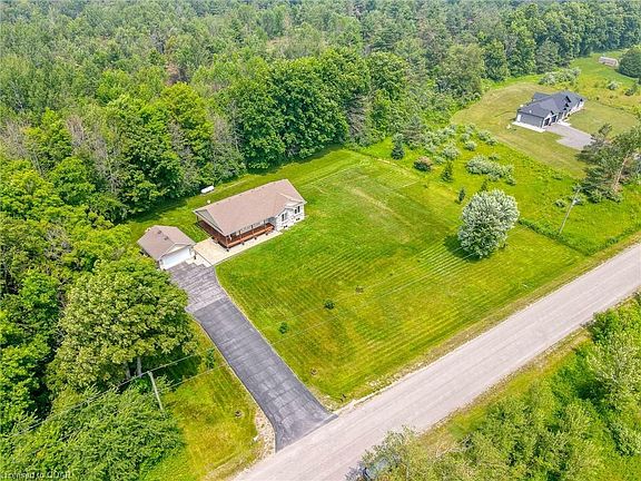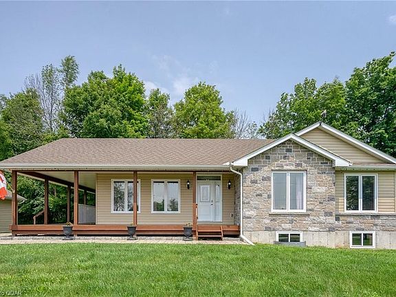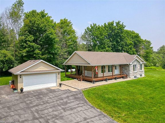 A country bungalow 1360 sqft . Vinyl and stone exterior and built in 2016 by Mike Voskamp and is situated on a 1 acre lot with West and North sides backing onto wooded areas. The road is a dead end and located between Colborne and Grafton. The home offers covered decks on 2 sides. Basement has an entrance from outside to full basement with a 4pc bath and a full unfinished space to utilize into a basement apartment. Also has an existing woodstove. Main floor offers an open concept kitchen with granite counters, combined Dining and Living room area. 3 bedrooms and 2 full baths. Detached 18.10x20.11 vinyl sided 2 car garage.