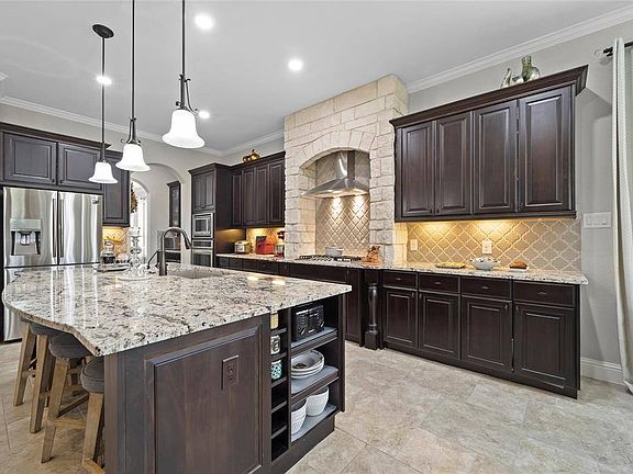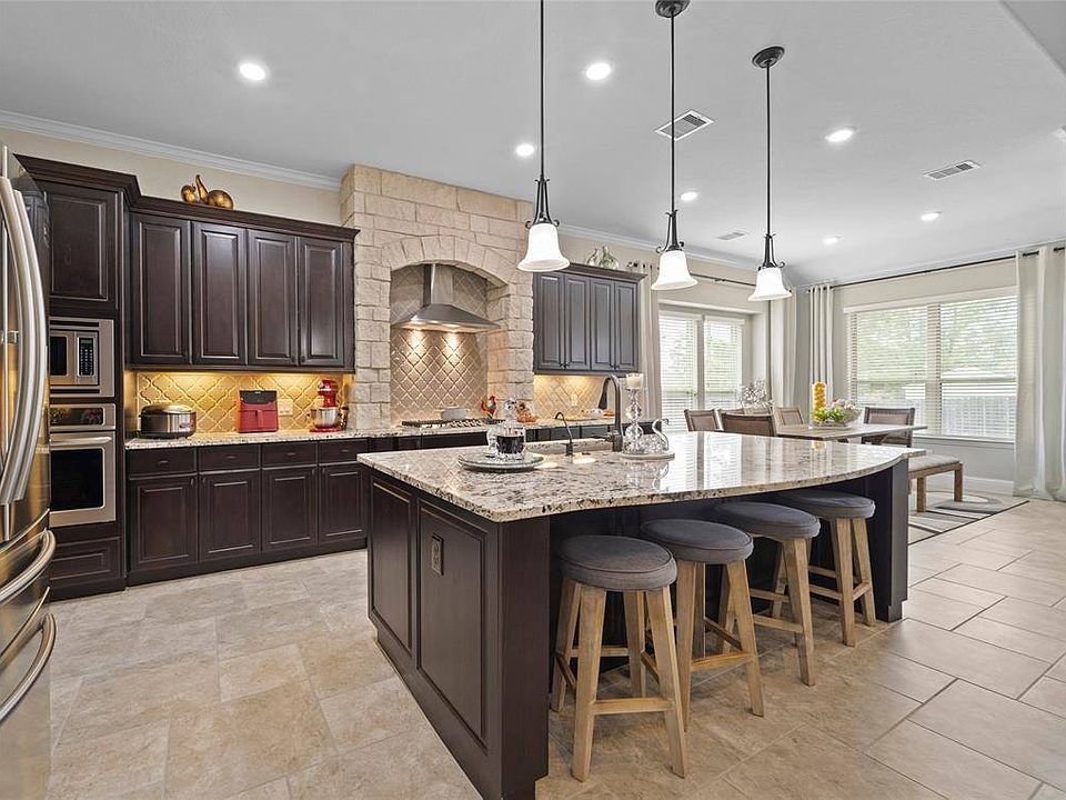 Village Builders Provence Series, ''Lorraine'' w/Brick, Stone & Stucco Exterior. 2 1st Floor Bedrooms w/Tile Floors - Primary & Guest Suite with Full Bath! Gourmet Kitchen Granite Island w/Breakfast Bar, Beech Cappuccino Cabinets, Custom Backsplash, Stainless Appliances & Stone Surround at Cooktop. Stunning Tile Flooring through Dining Rm/Entry/Family/Kitchen. Study has Ceiling Beams & Oak Hardwood Floor. Stone Fireplace Surround in Family Rm. Primary Suite has Corner Tub, Walk-in Shower, Granite Countertops & Large Walk-in Closet. Aquasana Whole House Water Filtration. Carpet upgraded w/10lb padding in Media Rm & Stairs with LED step lights. "Wood" tile throughout 2nd Floor. Wired/Setup for Internet in most rooms. Large Covered Patio Opens to Perfect Yard to enjoy the Outdoors w/o being burdened by lots of Landscaping. Oversized garage. Community amenities include 23-acre spring-fed Lake Woodtrace w/ canoe/kayak launch & fishing dock; 5 miles of greenbelt trails, footbridges & trails.