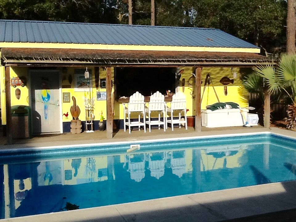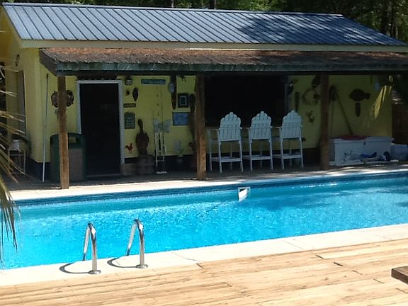 Hard floors, and ceramic tile. Life time guarantee on Windows. 19x30 tiki bar w/ oven, stove, microwave.