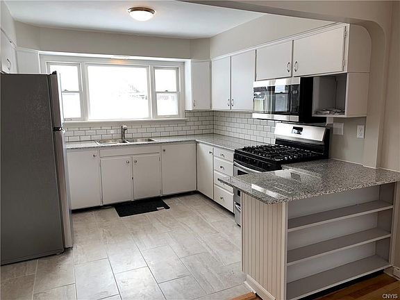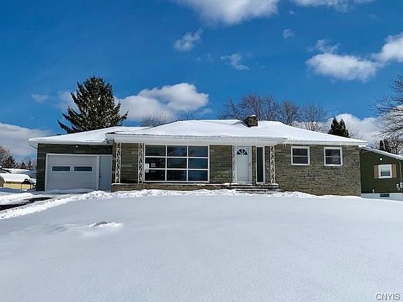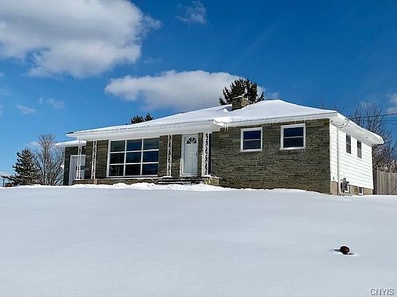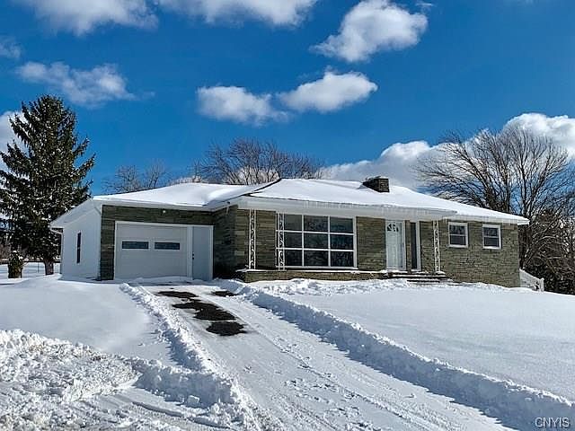 Majestic & remodeled Camillus Ranch featuring blue stone face, front newer hip style roof, new garage and entry doors, updated white kitchen featuring new stainless appliances, granite counters, ceramic floor and refinished hardwoods throughout. Modestly updated bath, 3 spacious bedrooms, large bright living room with blue stone wood fireplace open to formal dining room. Ceramic foyer entry, lower level offers finished laundry room with great built-in storage cabinets, 2nd full bath, new basement windows, new furnace, central air, new hot water tank, new electric service panel, updated lighting fixtures and more!
