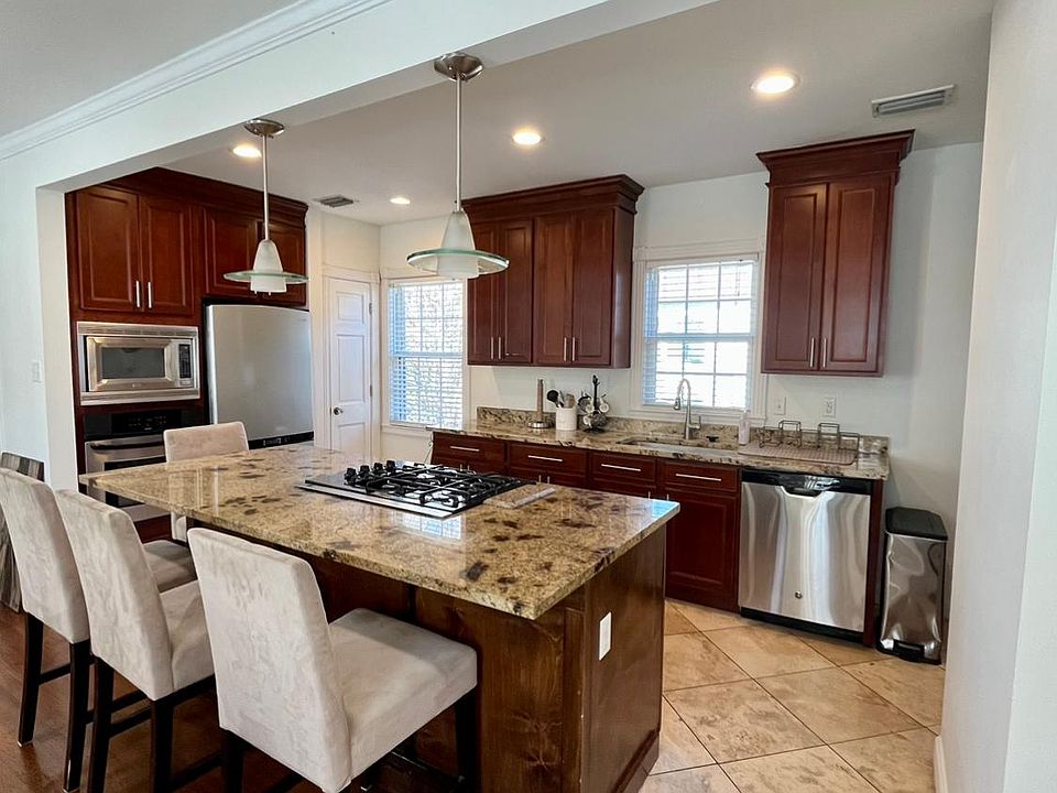 This gated community has a beautiful pool, hot tub, clubhouse, gas grill, onsite gym, sidewalks, and plenty of parking. An open-concept, second-story apartment with lots of natural light, brand new bathroom with walk-in shower, hand sprayer, custom vanity, subway tile wainscot, and granite. The kitchen has custom cabinetry, an island with gas cooktop and an extended bar for seating, a wall oven, a pantry, and a stackable washer and dryer, and granite counters. Large open living room with room for desk space and living area, or for a dining table and living area. Both bedrooms have ample closet space. One with a walk-in closet. Tankless water heater. Water is included in rent. Application and credit check required *unit is owned by a licensed Realtor in Alabama* Owner pays for water. Renter is responsible for gas and electricity. Last months rent due at signing. No smoking is allowed. Stackable washer and dryer included. Pets will be allowed at the owner's discretion.